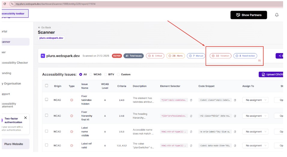 b) Additional filter based on the error weight: To define if it is an accessibility failure (“Violation”) or a potential accessibility (“Need review”) problem.